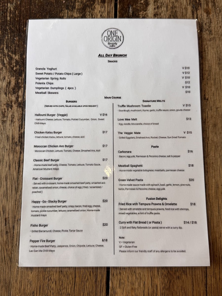 One Origin Specialty Coffee Menu